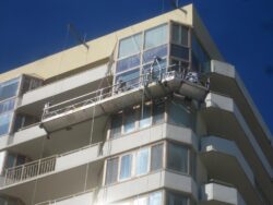Window Sealant Installation using suspended scaffolding on the exterior of condo at a Jersey Shore Mid Rise Condo.