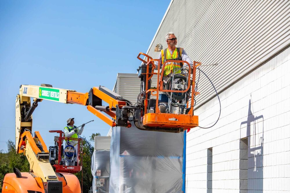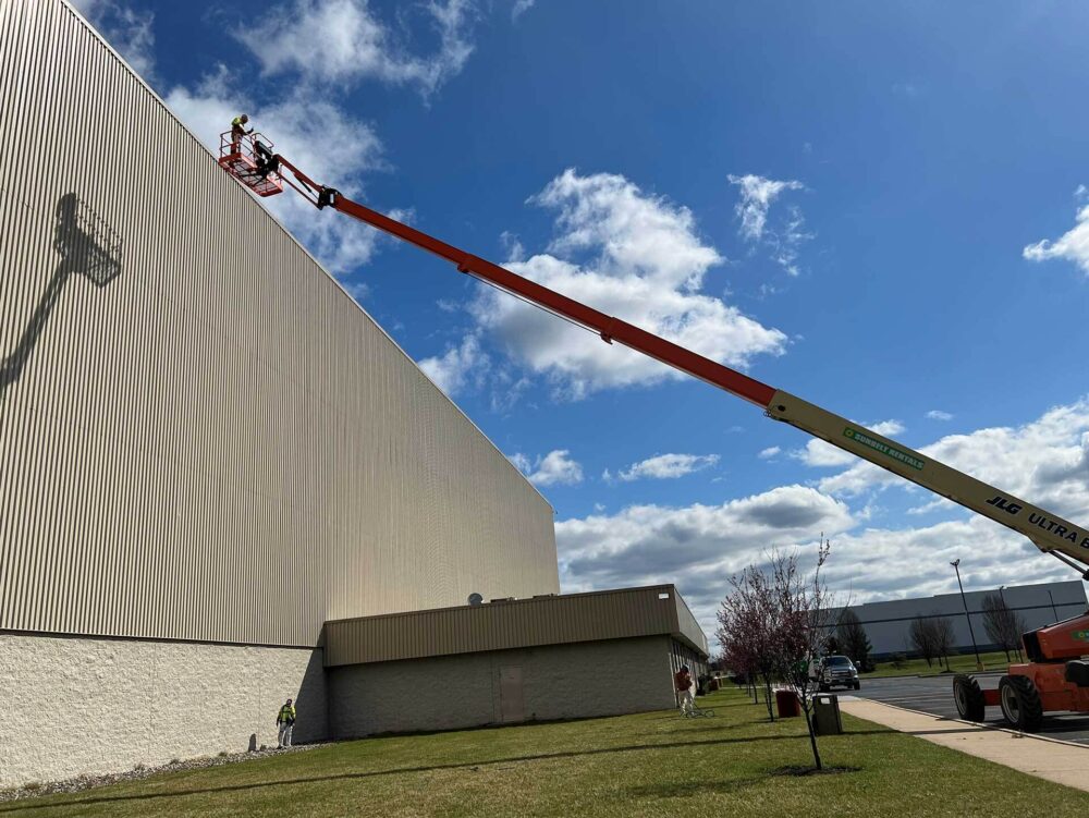Exterior Warehouse Painting & Arial Lift Access for Waterproofing of Disturb Facility in Cranbury, NJ - Alpine Painting and Sandblasting