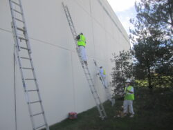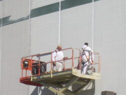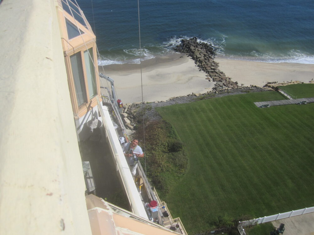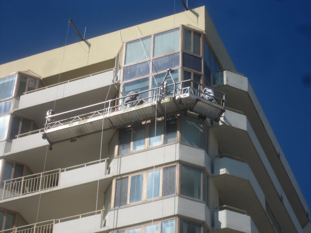 Swing Stage Scaffolding to Access Exterior Windows to apply new sealant to prevent water migration
